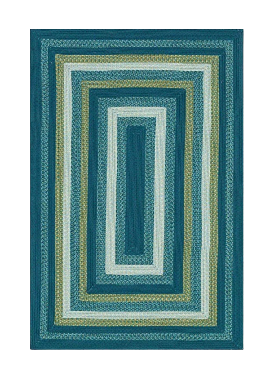 The epitome of charming cottage style, our Kingswood braided indoor/outdoor area rug exudes an artisan-crafted look and texture. Synthetic yarns create contrasting textures in a cool colorway of blues, aquas and green. A familiar striped box design distinguishes this casual rug. Available in 5x7ft. size.