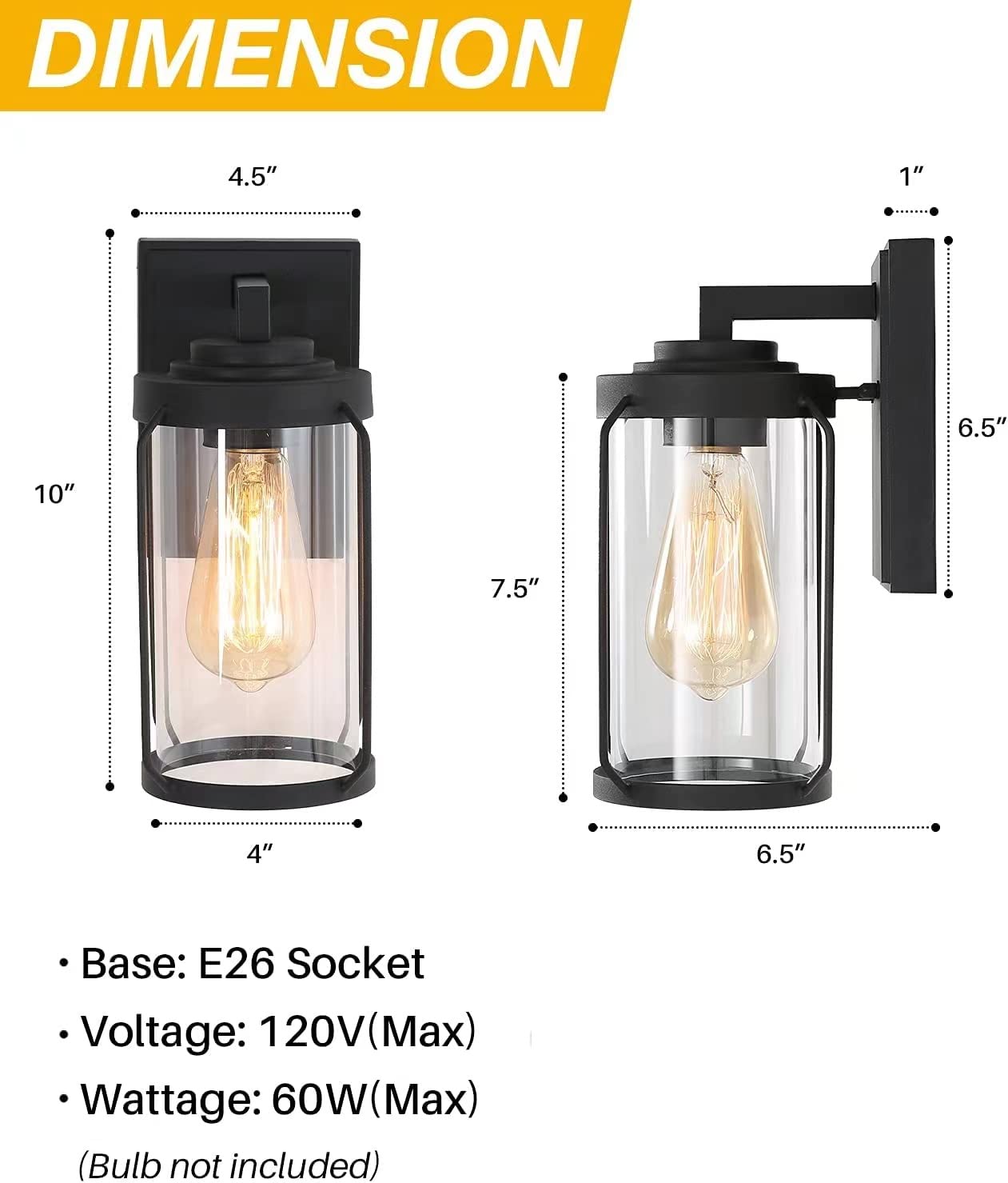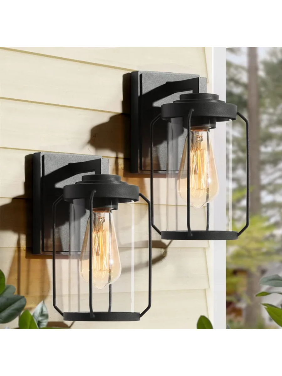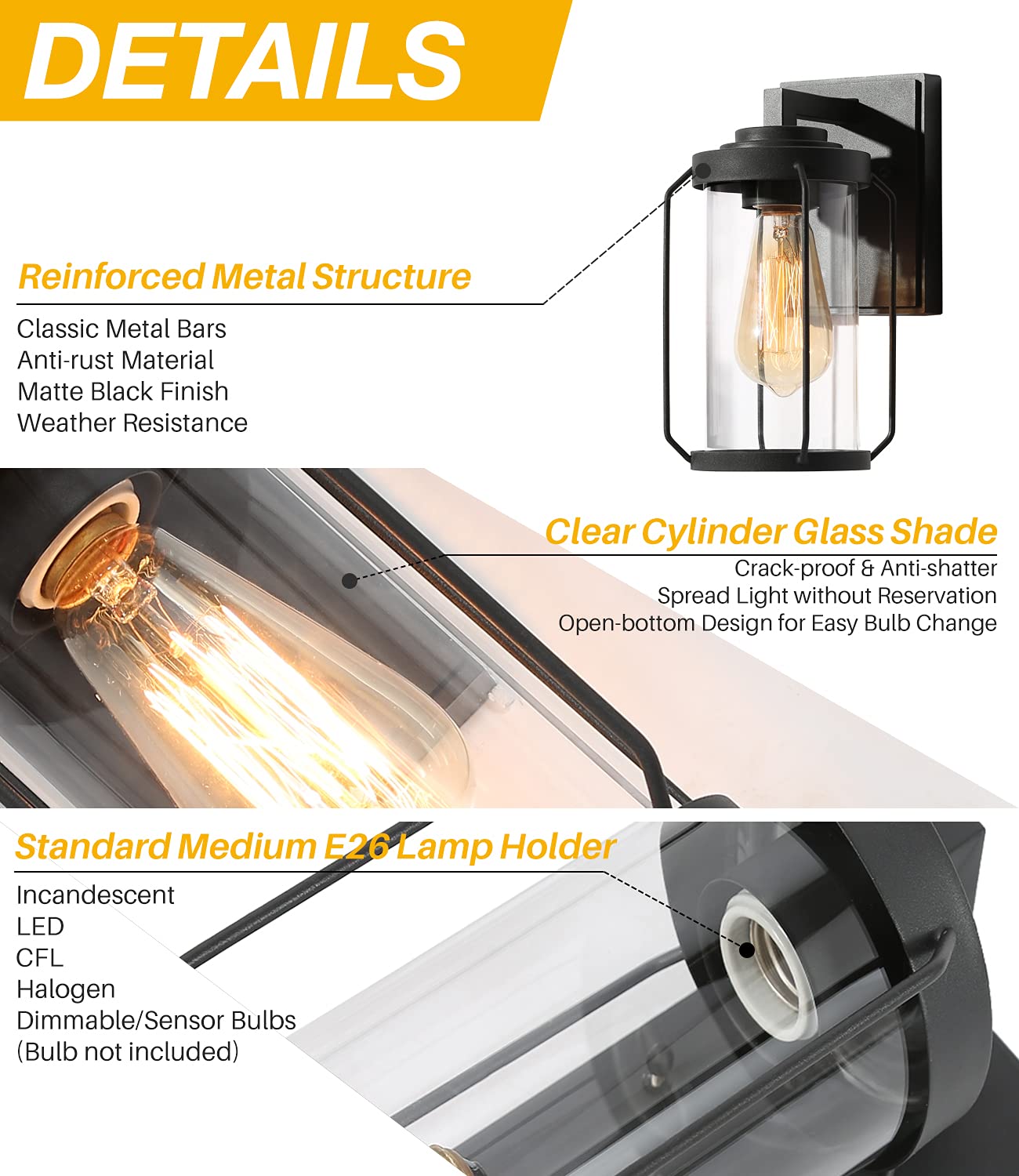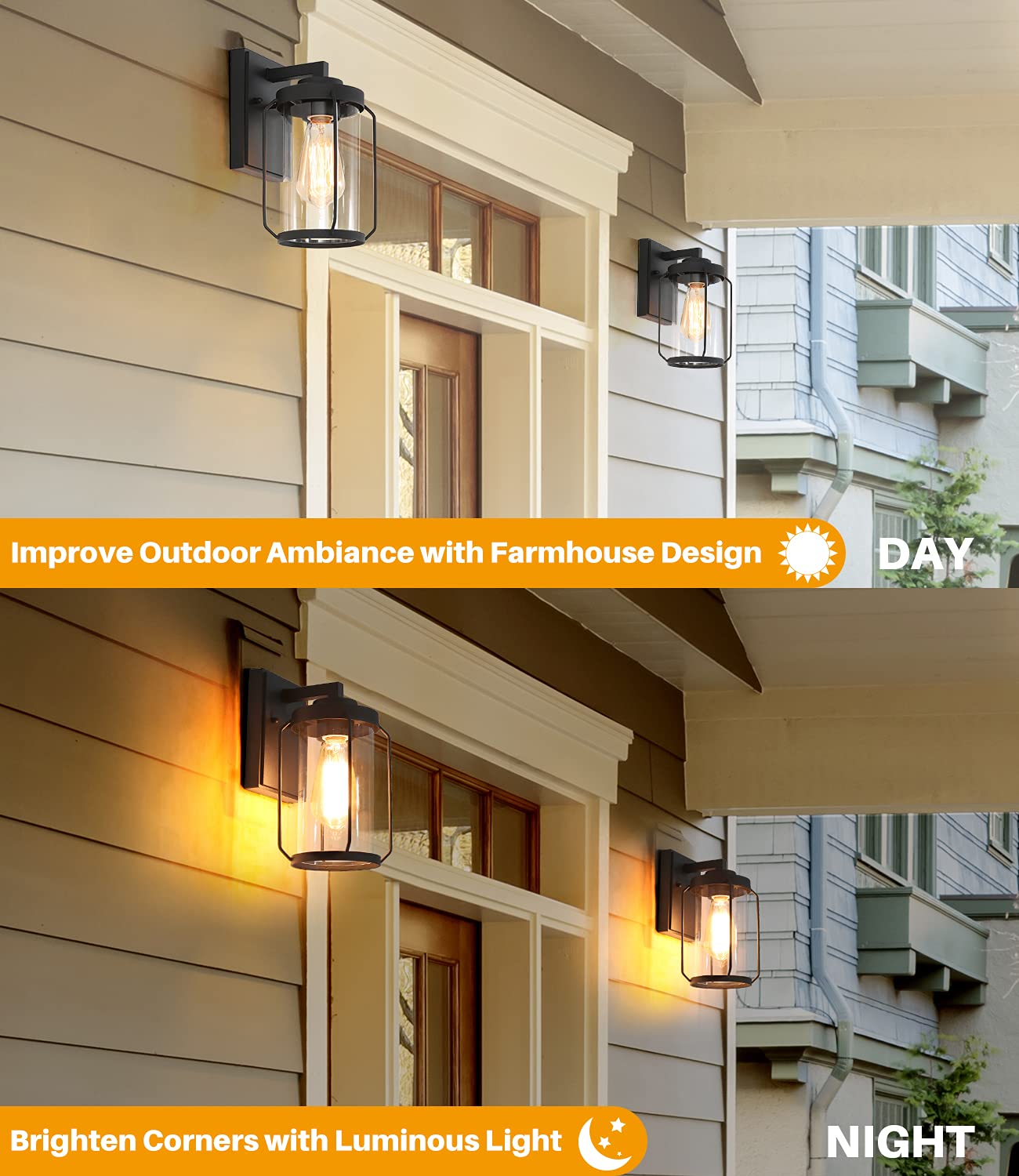 - [Farmhouse Outdoor Wall Light] Equipped with an enhanced cylinder metal frame, these 2 pack outdoor wall lanterns will spread a rustic farmhouse flair all around, while the decorated solid metal bars bring industrial style to your outdoor space. Clear glass shade helps the exterior light fixtures offer tremendous luminance to your exterior area without reservation and improves the night security efficiency