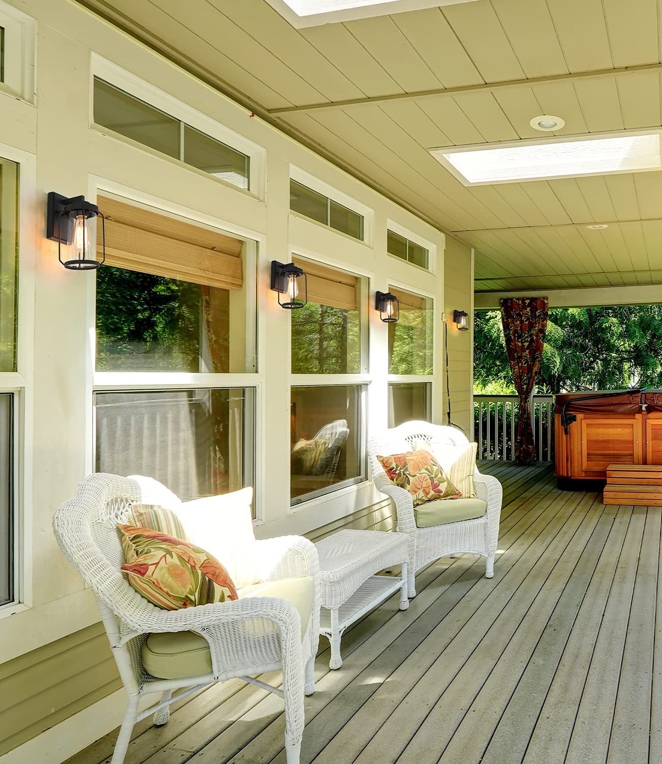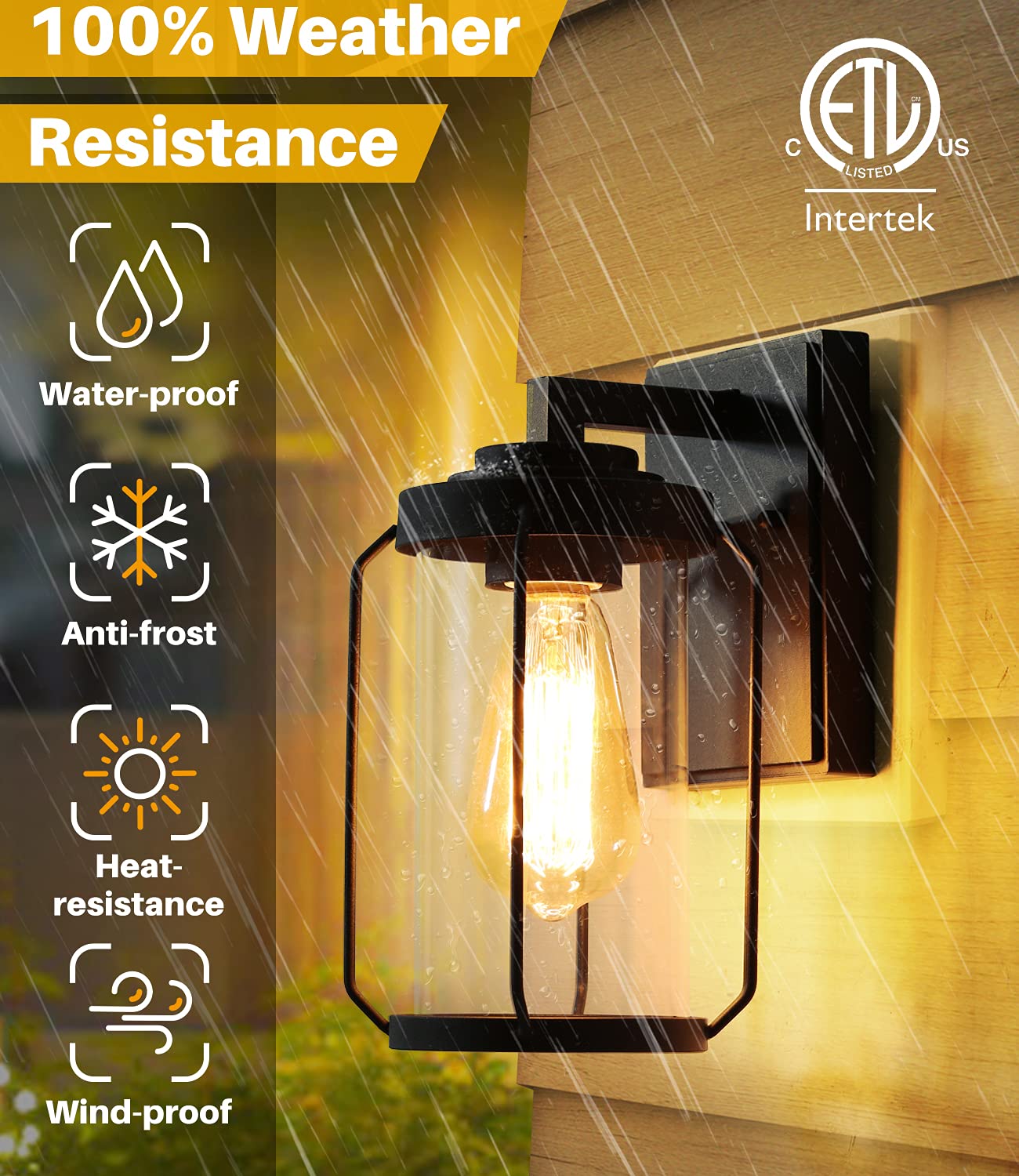 - [Extraordinary Outdoor Performance] These set of 2 outdoor lights for house are crafted from premium anti-rust metal with special corrosion-proof coating and thick glass, meant to illuminate your outdoor life for decades. Multiple weather element tests have been taken by the porch lights outdoor, enabling them to perform well in dry, wet, or high-temp situations for a long time.