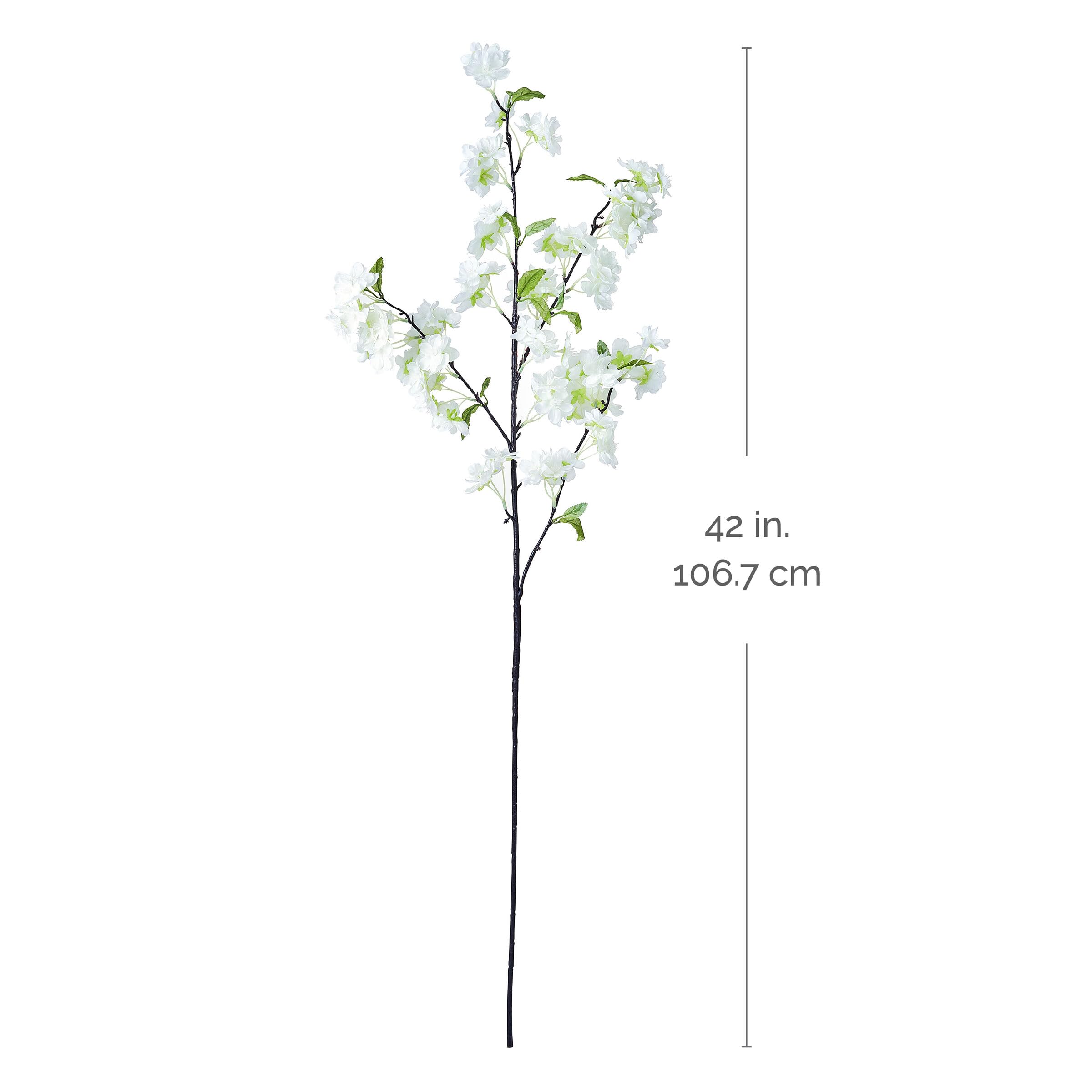 Details: This lifelike Artificial White Cherry Blossom Stem by Mikasa is made from soft-touch poly silk for a lifelike look and feel. The crisp white petals add an elegant decorative accent to any room. Artificial florals are the perfect, low-maintenance solution to bringing the serenity of the outdoors into your home–no sunlight or watering required. Realistic faux plants create a relaxing, welcoming atmosphere and brighten any office, bedroom, bathroom, kitchen, balcony, living room, apartment, café, or classroom. Stems feature a hidden wire for bending blossoms into a unique shape. Measures 14? L x 5? W x 39? H. .