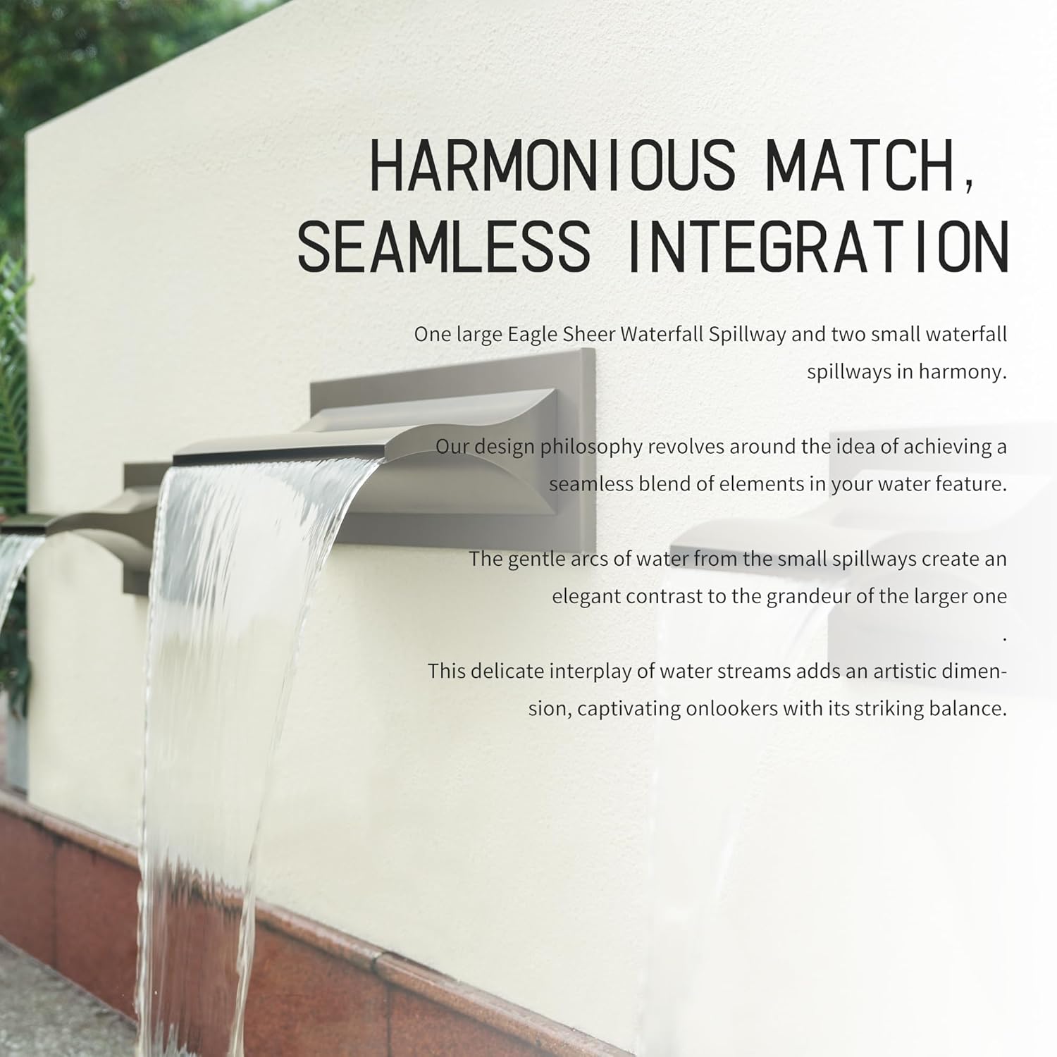 - Subtle Harmony: The majestic large Eagle Sheer Waterfall Spillway takes center stage, flanked gracefully by two smaller spillways. Together, they form a visual symphony that embodies perfection. The gentle arcs of water from the smaller spillways create an elegant contrast with the grandeur of the larger one, elevating the overall appeal of the water feature. This nuanced combination transcends mere aesthetics, enriching the charm and allure of your outdoor setting.