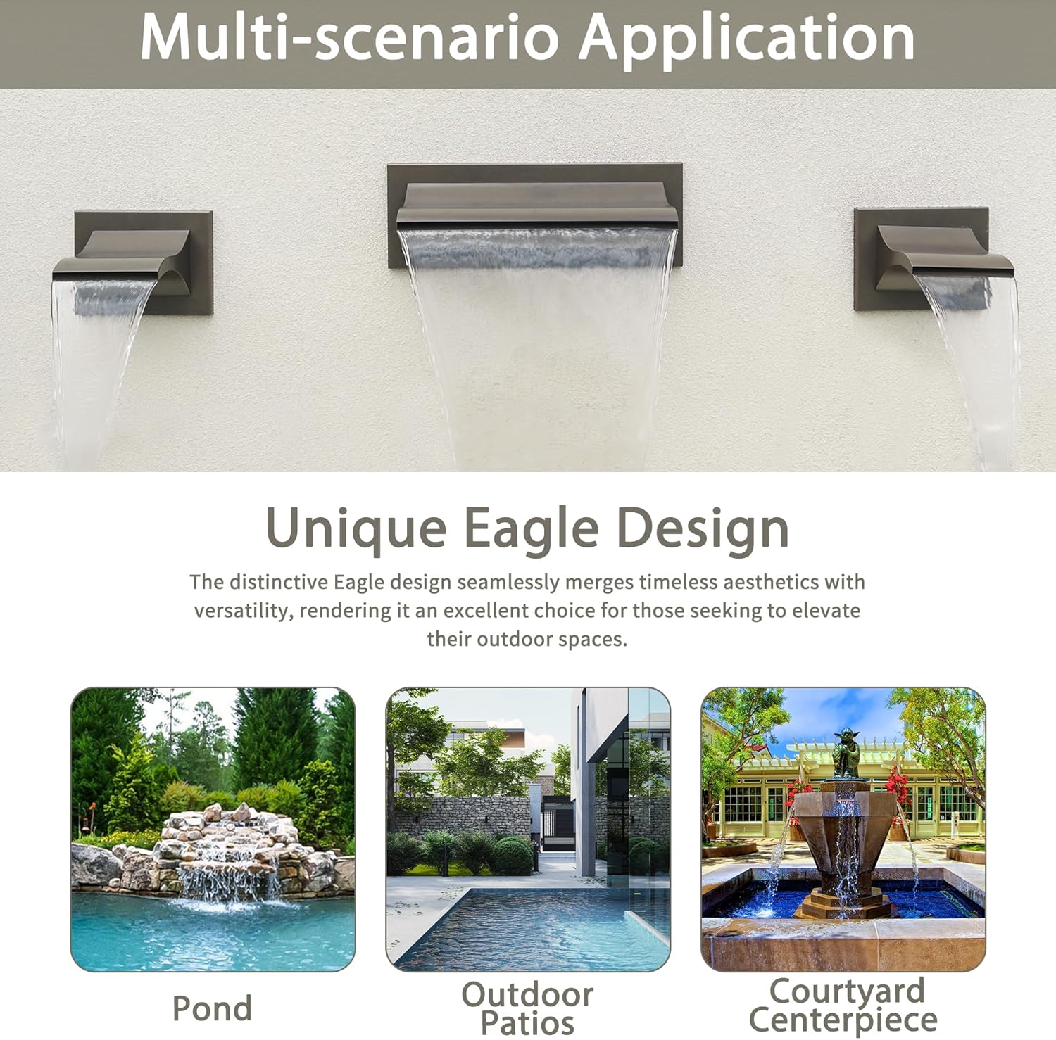 - Versatile Application: The 316 Stainless Steel Eagle Sheer Waterfall Spillway adds a touch of beauty, serenity, and elegance to various outdoor settings, enhancing your relaxation space with its gentle flowing water sounds that imbue a tranquil ambiance. Infusing both an artistic and natural touch, it becomes a multifunctional and ideal choice for landscape enthusiasts and design projects.