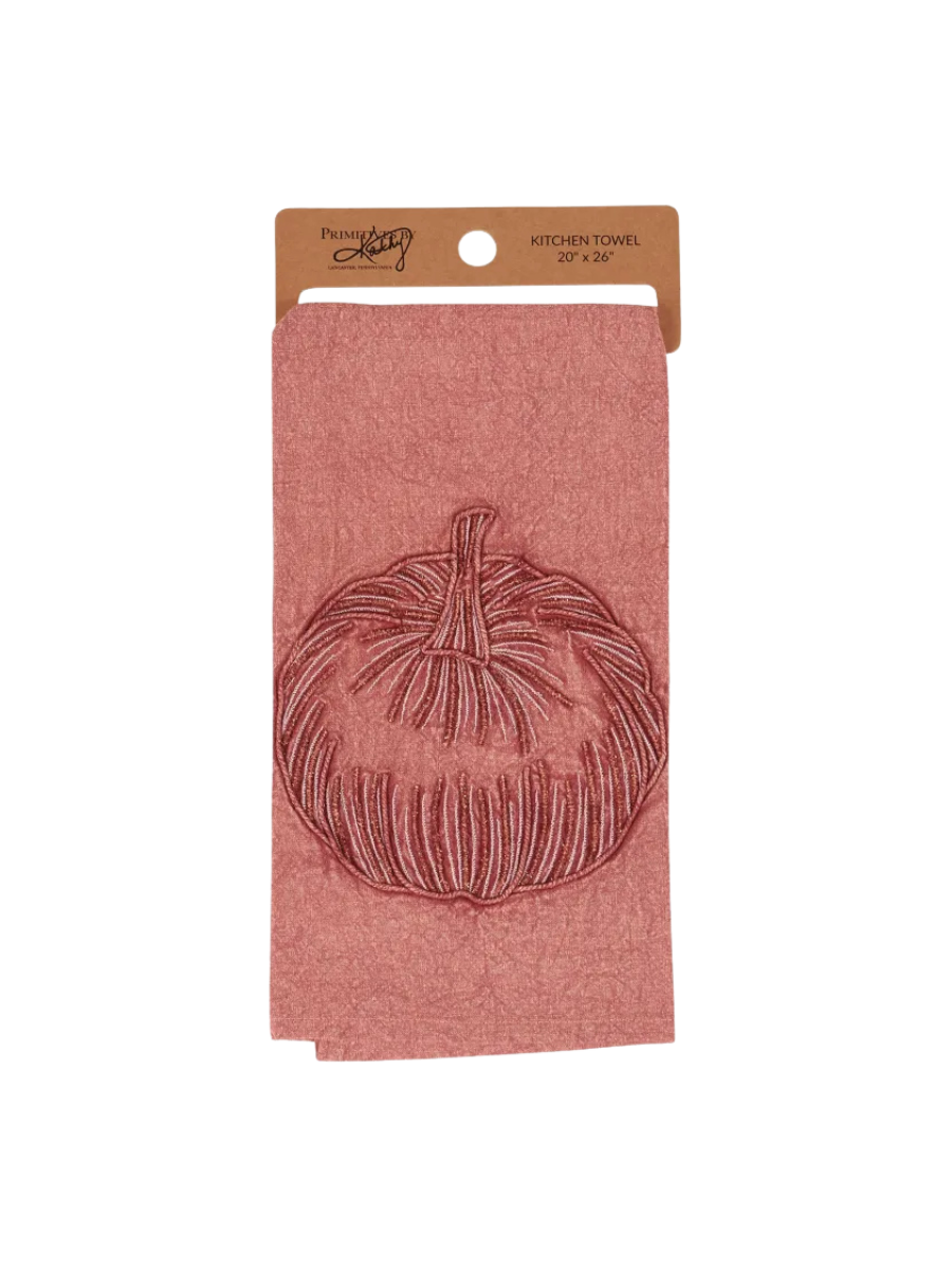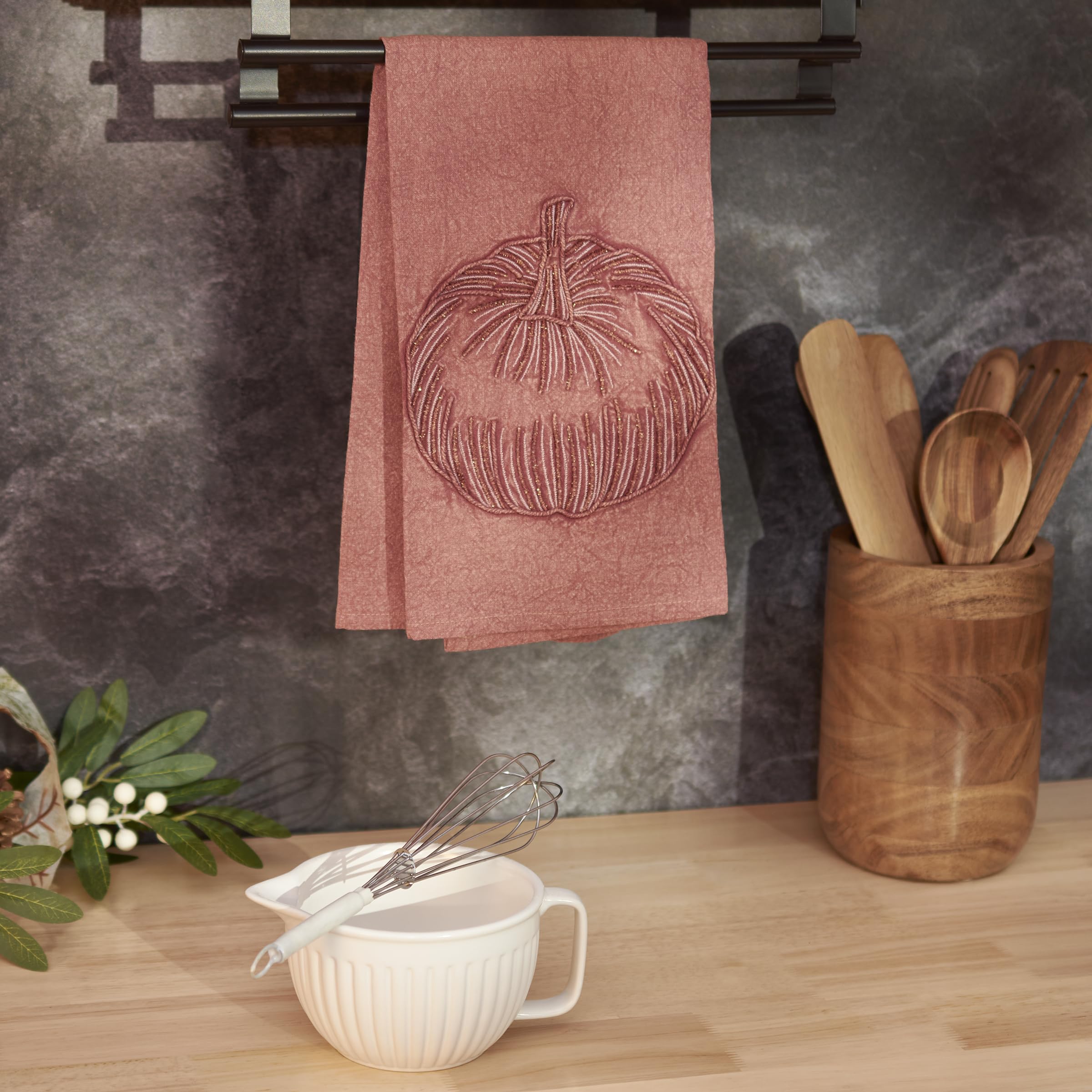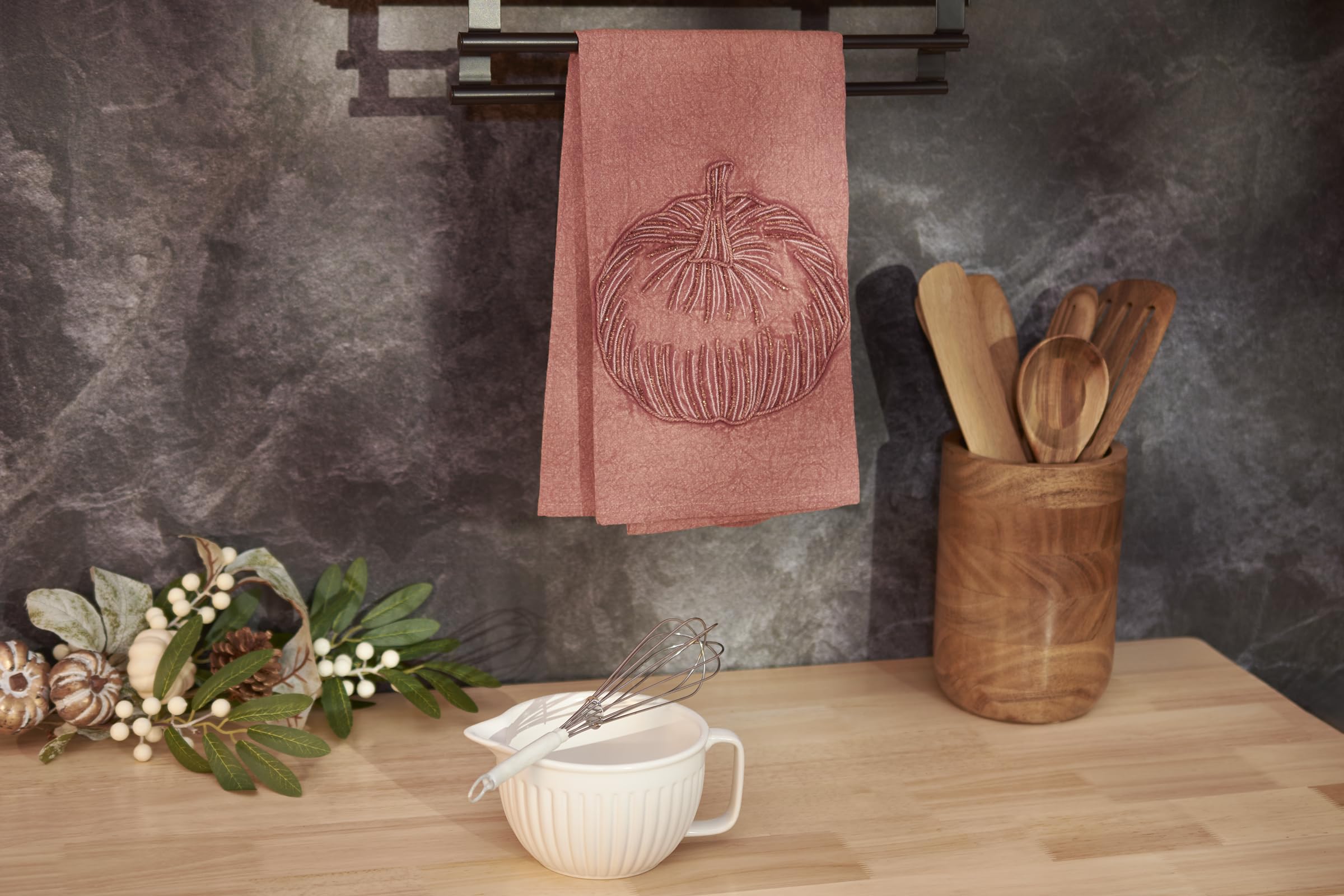 Details: A cotton-linen blend kitchen towel from our Fall & Harvest Collection displaying blush inspired autumn red color and a pumpkin design made with stitched and yarn details for added dimension. Kitchen towel is stonewashed for a naturally aged appearance. Our Blush Pumpkin kitchen towel is conveniently machine-washable for easy cleaning. A stylish fall-themed kitchen accessory perfect for seasonal use.